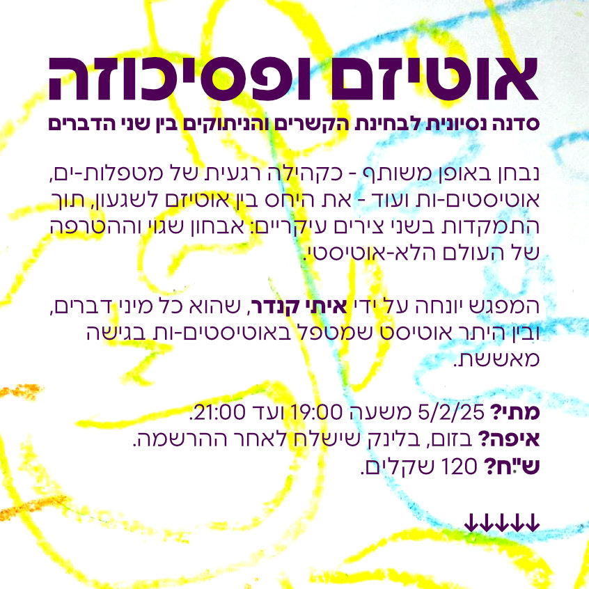 ב-5/2/25 בשעה 19:00 אנחה סדנה בת שעתיים על הקשר וחוסר הקשר בין פסיכוזה ואוטיזם. אפשר להרשם אליה כאן:
